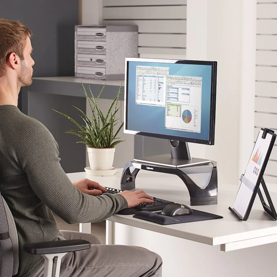 Elevate a screen to eye level with this Smart Suites corner monitor riser. The triangular design ensures easy placement into corner spaces to save space, and it can support up to 40 pounds. With three different height adjustments in this Fellowes corner monitor riser, it is easy to find the ideal height to reduce the stress on necks and backs during long working hours.