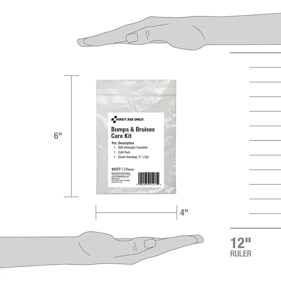Handle bump and bruise injuries with ease with this Bumps & Bruises Care Kit. Perfectly portioned to contain just what you need to treat minor bumps or bruises, the single use pack may be discarded after use. Refills the 91575 Care Kit or supplements existing first aid kits.