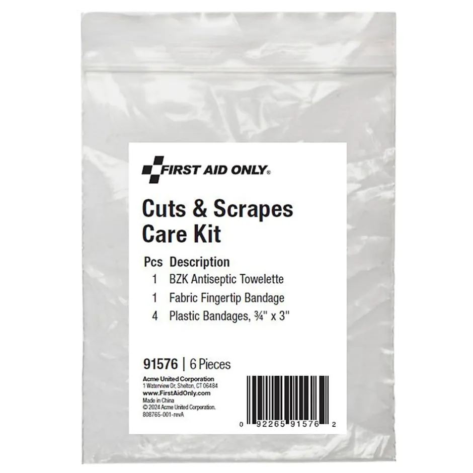 Handle cut and scrapes injuries with ease with this Cuts & Scraps Care Kit. Perfectly portioned to contain just what you need to treat minor cuts or scraps, the single use pack may be discarded after use. Refills the 91575 Care Kit or supplements existing first aid kits.