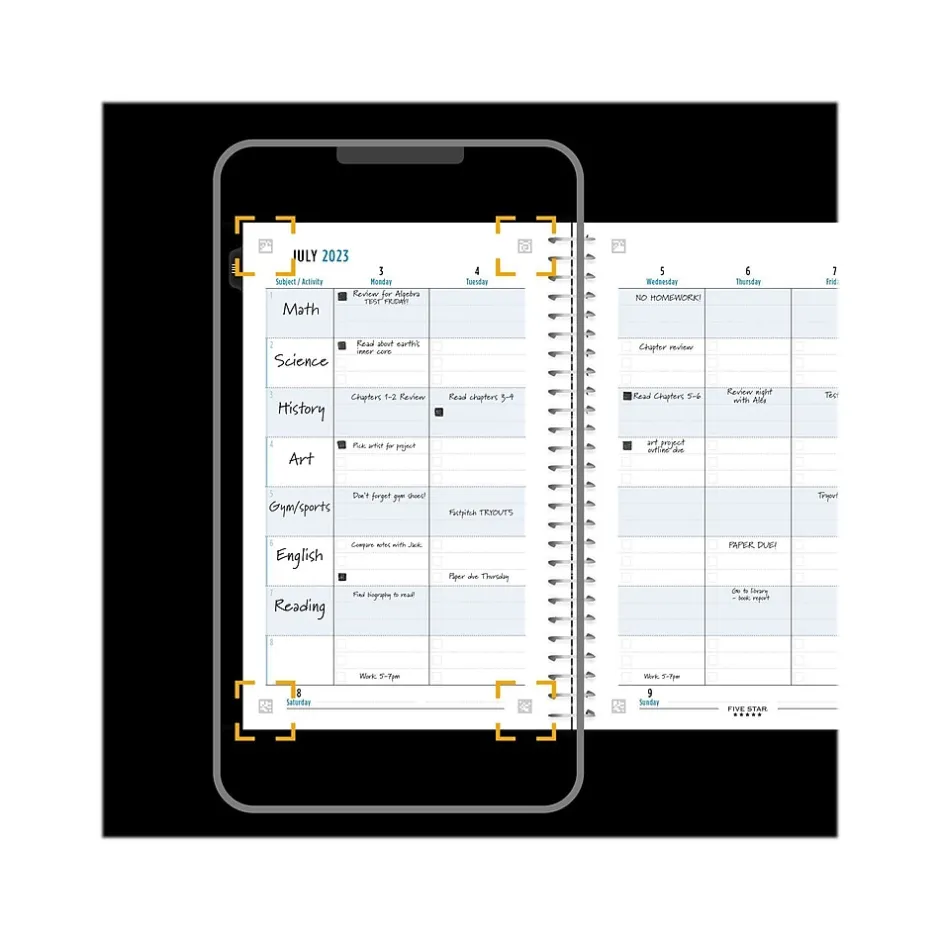 - One week per two-page spread includes ruled writing space for up to eight subjects and weekday checkboxes to mark off priorities; one month per two-page spread features unruled daily blocks, a to-do list column with check boxes, and unruled notes sections