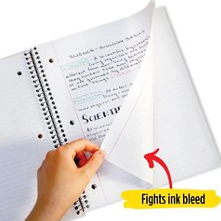 - 5 subject notebook has 200 double-sided, wide ruled sheets that fight ink bleed and are perforated for easy tear out. Sheets measure 8″ x 10 1/2″ when torn out.
