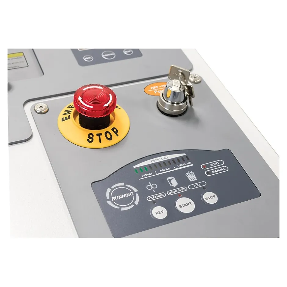- LED control panel displays operational status and offers jam protection with auto reverse and auto stop; sensors stop the motor automatically if any of the doors are open or the waste bin is full