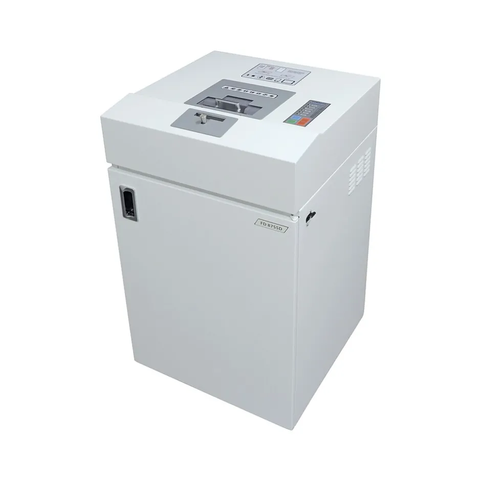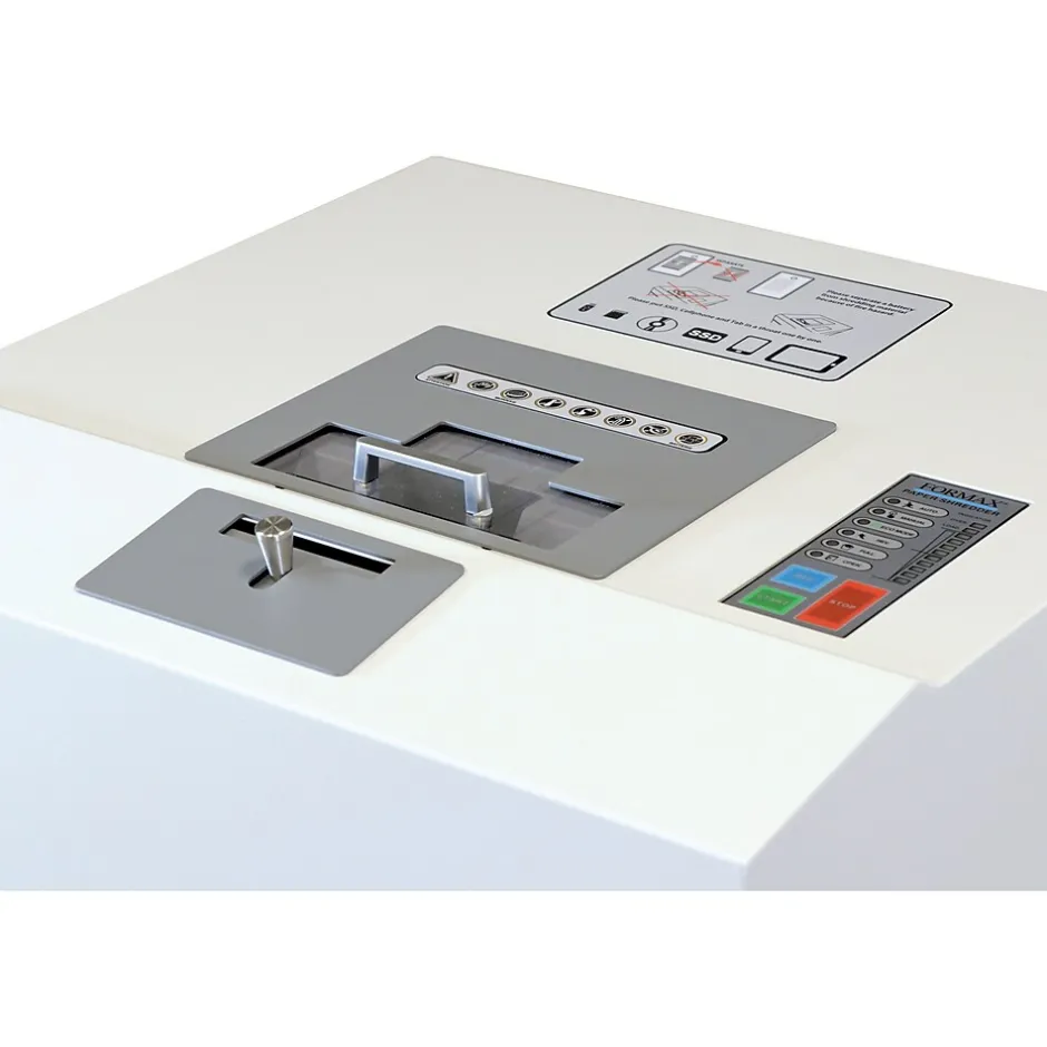 The Formax OnSite multimedia office shredder is designed for the modern technological world. It easily shreds mobile phones, SSDs, mini tablets, USB drives, SD cards, and more. It’s whisper-quiet, making it ideal for the office environment. Plus, it operates on standard 120V power and features heavy-duty casters so it doesn’t need a dedicated power outlet or location. Commercial-grade features include a user-friendly LED control panel, a sturdy all-metal cabinet on casters, solid steel cutting blades, and a rugged chain-driven motor. Three unique enclosed feed options allow users to safely shred a variety of media up to 6.5″ wide. With its commercial-grade construction and features, the OnSite sets the standard for safety and security.