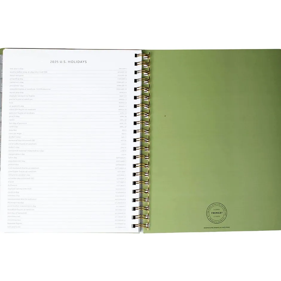Stay organized and on track with the Fringe Magnolia work-life balance planner. Features include a sturdy paperback cover with metallic gold-tone foil design accent, 12 tab dividers (spanning from January 2025 to December 2025), monthly grid spreads, weekly planning pages to track work and life activities, pages for notes, a gold-tone foil sticker sheet, and a twin-ring spiral binding.