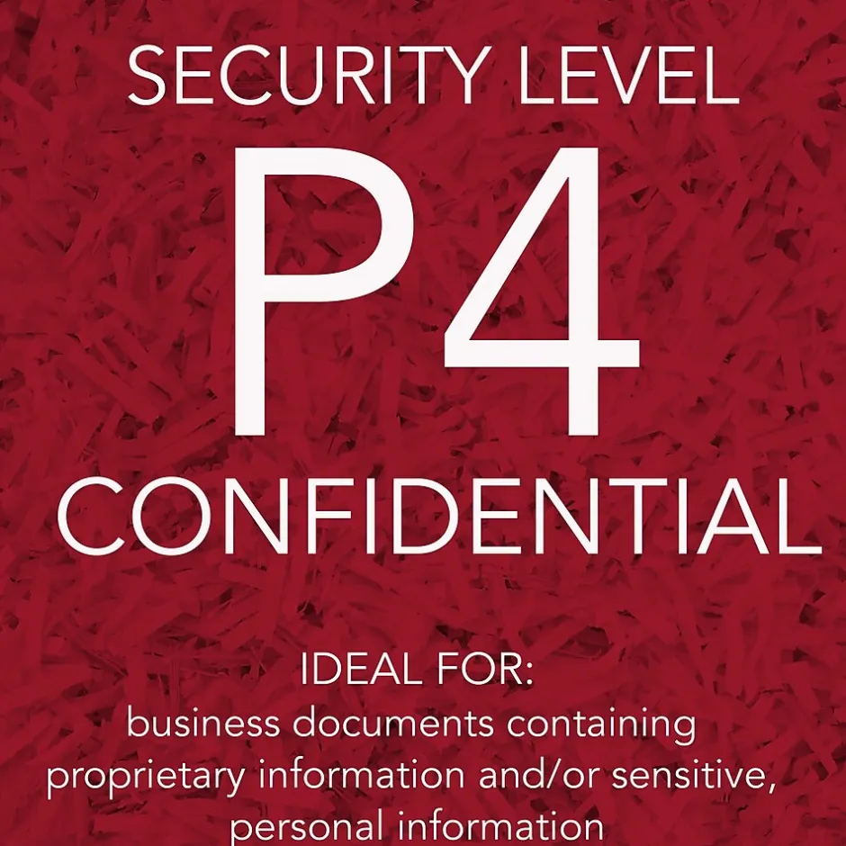 | Shreds Paper Clips Shredder security level refers to the level of paper destruction and is measured on seven levels: P-1 to P-7. Level P-1 produces the largest particles after shredding and level P-7 produces the smallest particles after shredding. A higher shredder security level is recommended for highly sensitive or confidential documents, while a lower shredder security level is recommended for general shredding purposes. | P-4 |