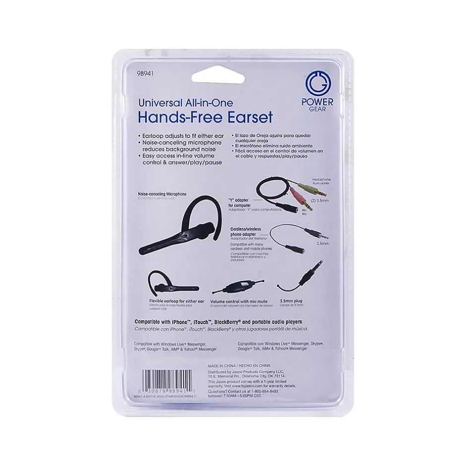 Improve call quality and have more productive discussions with this hands-free earset. A powerful speaker delivers sharp, detailed audio, and a noise-canceling microphone helps others hear you by filtering out background noise. Featuring on-ear controls, this hands-free earset lets you mute the mic and adjust call volume on the fly. The included adapter cables provide compatibility with smartphones, cordless phones, and computers, making this GE universal all-in-one hands-free earset suitable for managing calls across multiple devices.