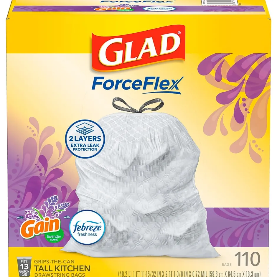 Let the stretchable strength of Glad ForceFlex handle all the messes our busy daily life can throw at it and then some. Glad Tall Kitchen Drawstring Trash Bags are designed with ForceFlex technology to give extra flex as it expands around sharp edges and heavy loads, so you can pack it in while resisting tears, rips and punctures. These trash bags are designed with two layers for extra leak protection. RipGuard and LeakGuard technology prevent seepage of liquids and keep trash contained. Fight nasty kitchen odors with the exclusive Glad trash bag combination of steady release of Febreze freshness and irresistible Gain Lavender scent that traps, locks and neutralizes odors. The durable Grips The Can Drawstring ensures a tight grip on the trash can to keep it in place. Take the trash to the curb with no fear of leaks and tears, and no frustration. FEBREZE and GAIN are used under license from The Procter & Gamble Company or its affiliates.