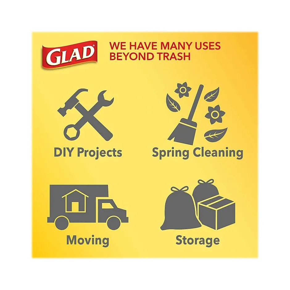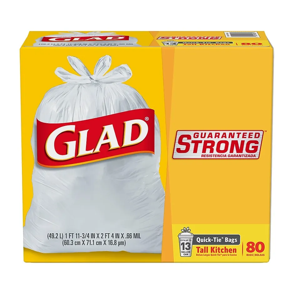 The Glad Quick-Tie tall kitchen trash bag is designed with strong and dependable flaps to keep the bag securely shut. This trash bag features a diamond texture that stretches around objects to prevent rips and tears, making it easy to lift and transport the bag even when fully loaded. The four Quick-Tie flaps close the bag securely to keep trash inside. The 13 gal. capacity is perfect for kitchens, break rooms, or workplaces.