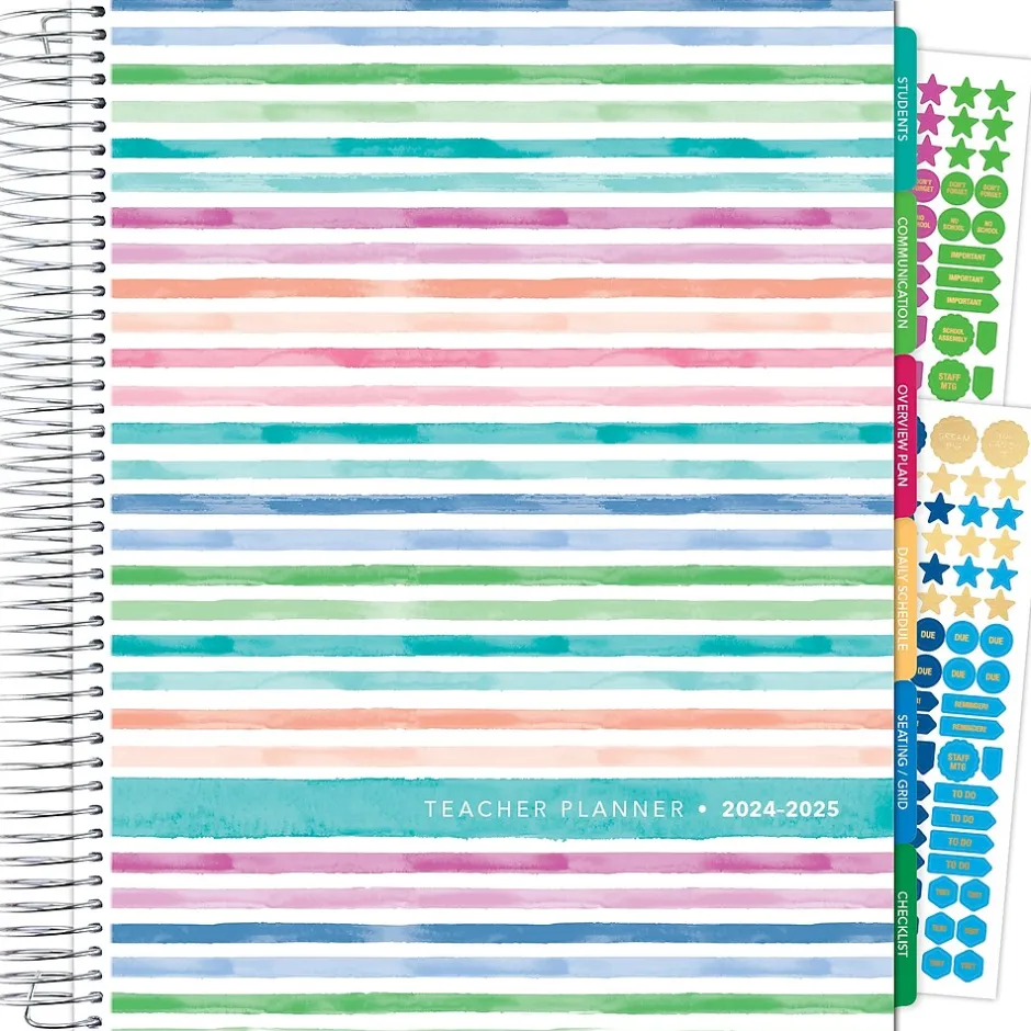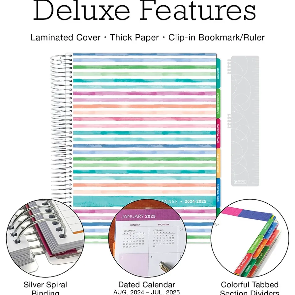 - Our deluxe teacher planner is Aug ’24 – Aug ’25, 8.5×11, Full color, 9 Tabbed sections, 5 Sticker Sheets, Bookmark and Pocket Folder. High quality, durable and built to last the entire school year.