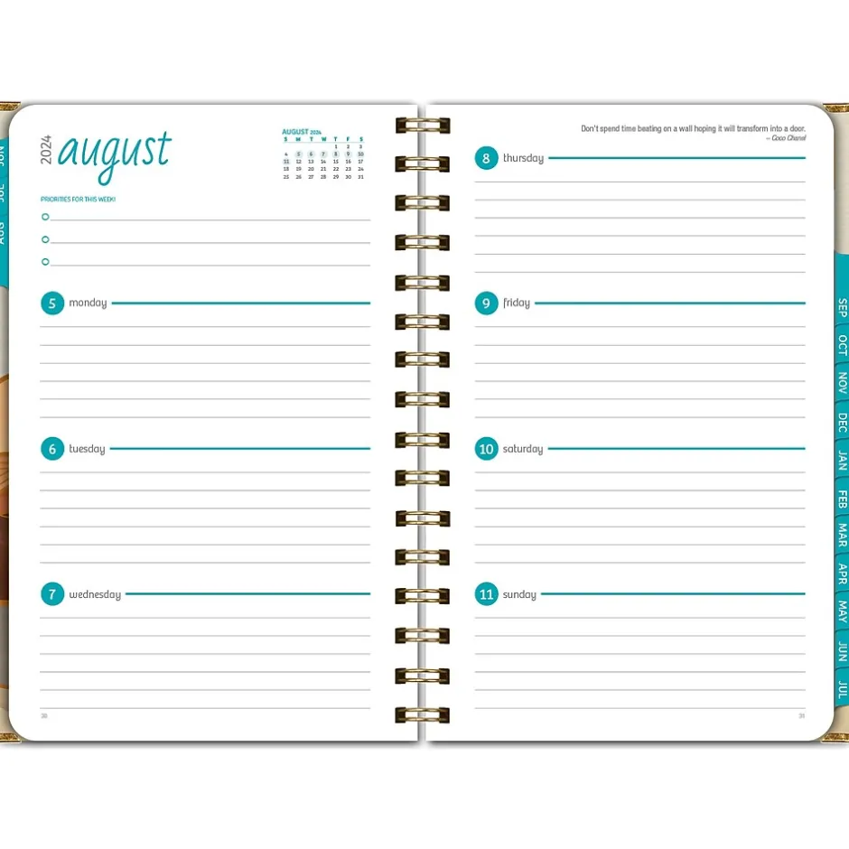 - Two-page monthly spreads with space for notes and previous and next month reference; two-page weekly spreads with space for top priorities for the week and current month reference calendar