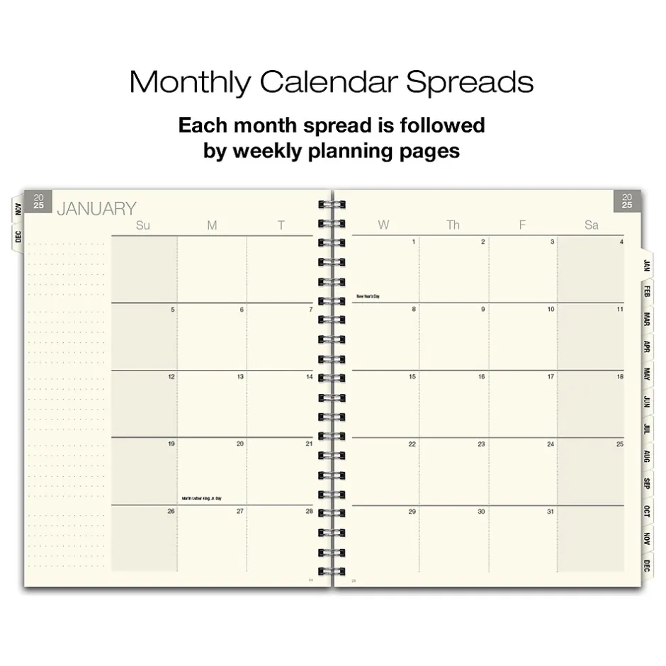 This Global Printed Products monthly planner is an essential companion for professionals who want to streamline their self-organization and keep every crucial detail at their fingertips. Meticulously designed, the planner is wrapped in a beautiful cover, exuding elegance and durability. Comes with five cover designs bound into the book. Use your favorite design by simply tearing out the other covers, or remove the covers one by one throughout the year to change up the look.