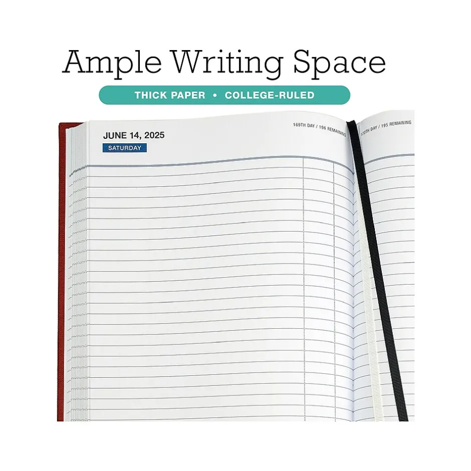 Introducing the Global Printed Products 2025 daily diary. Keep track of this year’s progress and events with one full, dated planner, offering daily pages spanning the calendar year. This meticulously designed 8″ x 12.5″ diary features a cardboard cover wrapped in red textured paper, exuding elegance and durability. It covers a 12-month date range from January 2025 through December 2025.
