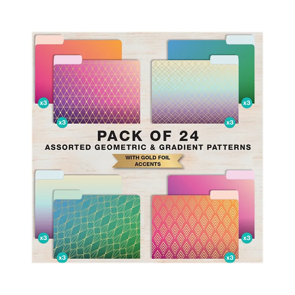 - Printed on durable stock, these file folders feature four gorgeous and stylish Geometric Foil designs with rich and vivid colors (six of each design)
