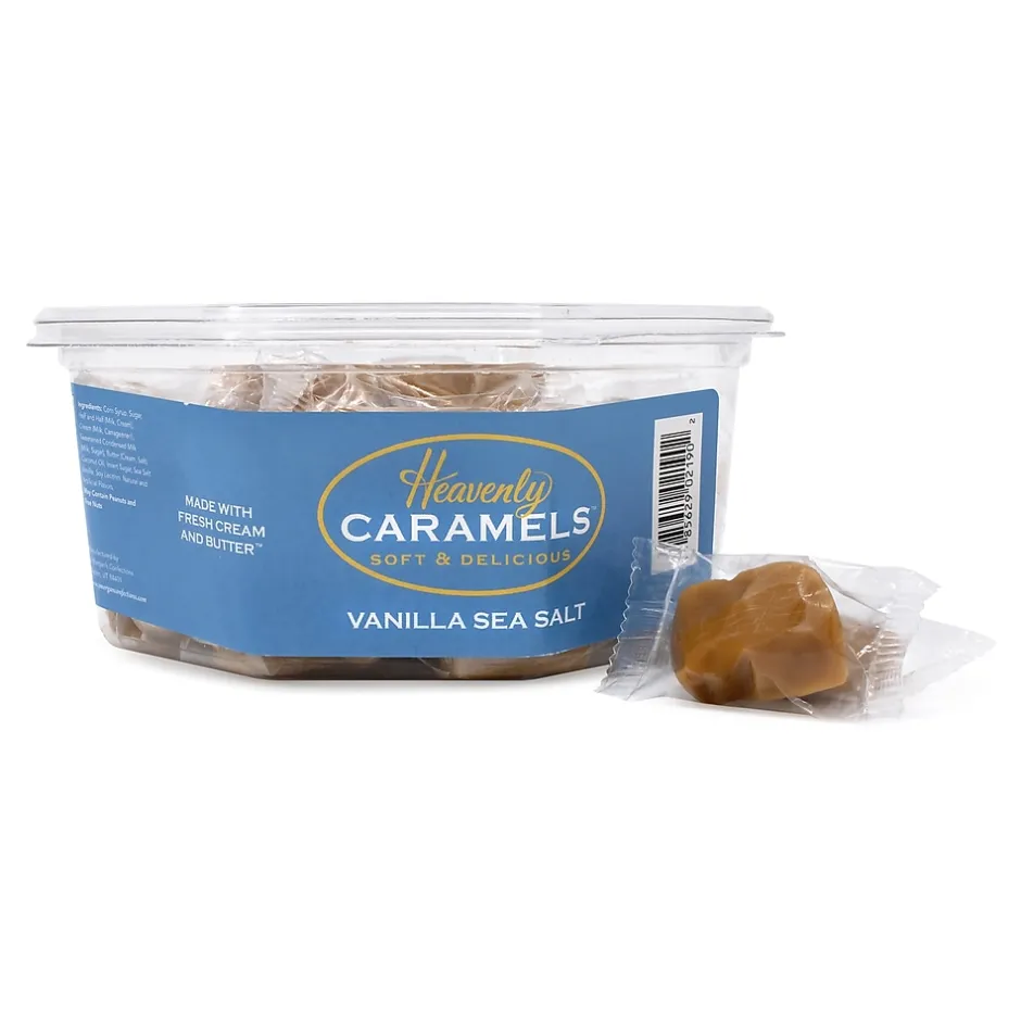 - A 45-Piece tub of Heavenly Caramels soft and delicious Vanilla Sea Salt caramel pieces