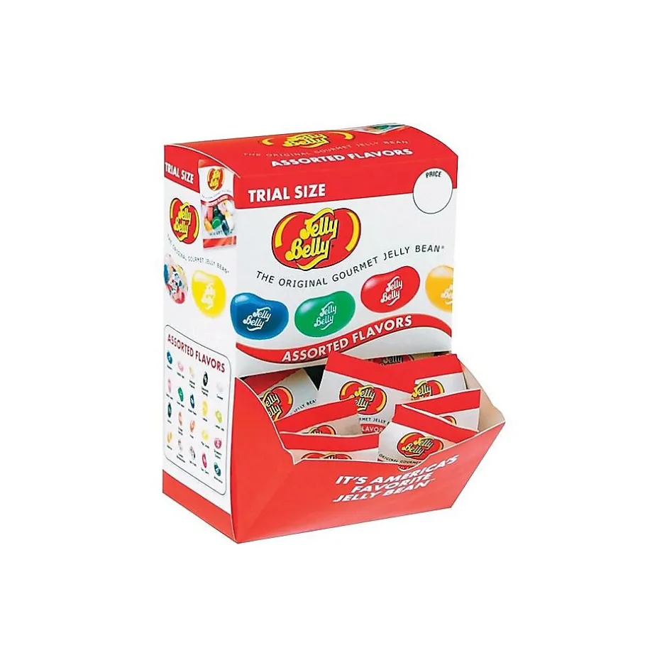 Savor 20 assorted flavors of Jelly Belly gourmet jelly beans. Each box contains 80 individually wrapped pouches of jelly beans in convenient trial-size units, and the recipe is kosher, fat-free, gluten-free, and peanut-free. Suitable for vegetarian and vegan diets, these sweet treats contain no dairy, eggs, or gelatin. These Jelly Belly assorted gourmet jelly beans are a versatile snack with a range of fun flavors.