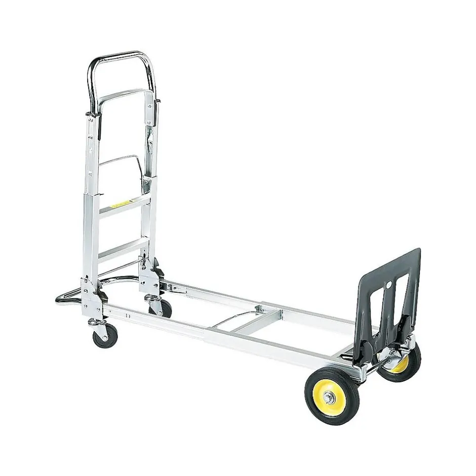 Make moving heavy loads easy with this Safco Hide-Away convertible hand truck. The flexible design lets you extend the hand truck or easily hide it away, and foldable design means you can keep it close at hand and ready for immediate use. Weighing in at 21 pounds, the hand truck features an aluminum frame and steel handles that extend for use and retract for storage, and the aluminum platform can lengthen more than 50 percent to adapt to varying load sizes. Two solid rubber wheels and two solid rubber casters give this Safco Hide-Away convertible hand truck a 250-pound capacity as a two-wheel conveyance and a 400-pound capacity as a platform.
