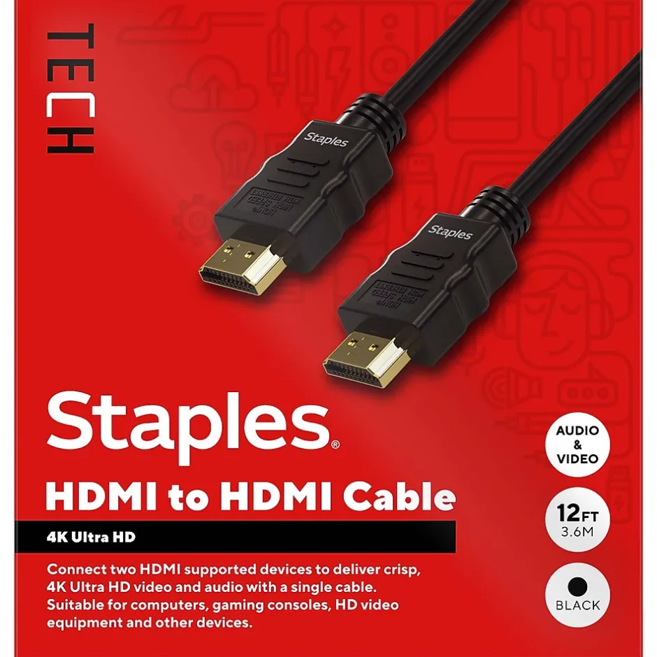 Delivering crisp 4K Ultra HD resolution this HDMI cable promises clear audio and video for an exceptional experience. Featuring a 12-foot cord, this cable provides you ample length to connect devices across your work or entertainment station. This cord is the perfect choice for outfitting your work, gaming or media space. Enjoy high resolution audio and video between devices so you can upgrade your home or office workspace and do your best work. Backed by Staples Brands 100% satisfaction guarantee, or your money back.