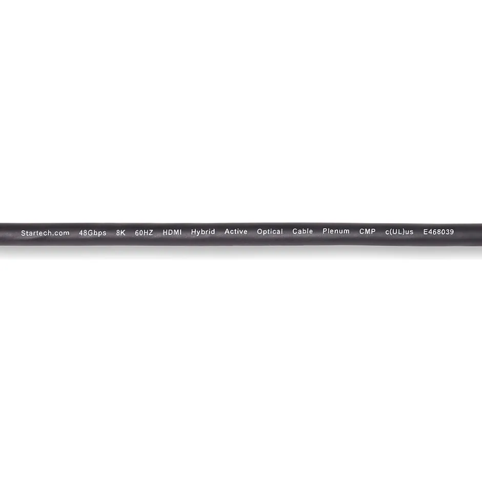 Route this ultra high-speed HDMI 2.1 hybrid active optical cable (AOC) through office plenum spaces for long-distance transmission of 8K 60Hz video and high-quality audio. The HDMI 2.1 AOC incorporates a hybrid construction consisting of fiber optic cores and copper conductors. This enables the offloading of low-bandwidth signals (EDID/HDCP/eARC) to maintain high-bandwidth transmission of 8K 60Hz video over fiber. The fiber optic inner cores and shielded copper conductors greatly reduce EMI for optimal signal quality across longer distances. This Plenum-Rated HDMI 2.1 cable features a CMP-rated cable jacket with low-smoke and flame characteristics. It is great for use in plenum spaces in buildings (e.g., ceilings and in-wall installations). The optical fiber core is reinforced with Aramid strands for tensile strength and is rated to withstand over 6000 bending cycles at 120 degrees. This protects the cable from damage when routing through tight spaces requiring multiple bends.