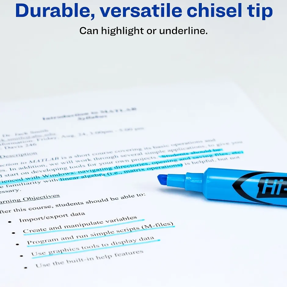 Underline or cover text with this desk-style highlighter. The chisel tip lets you create fine lines or broad strokes, and the light-blue hue makes it easy to color-code concepts and data. This Avery Hi-Liter chisel-tip highlighter features nontoxic ink, so it’s ideal for use in classrooms or offices.
