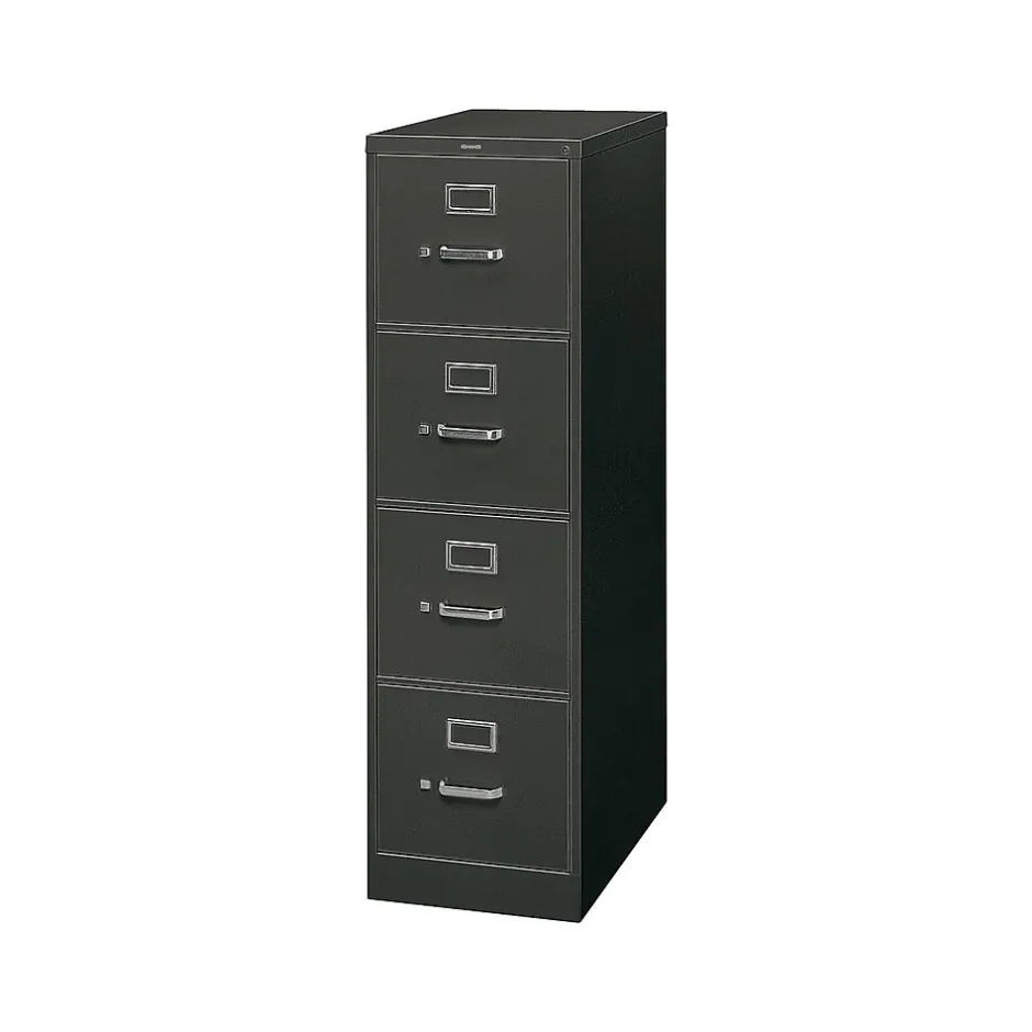 - Four-drawer vertical filing cabinet holds letter-size documents