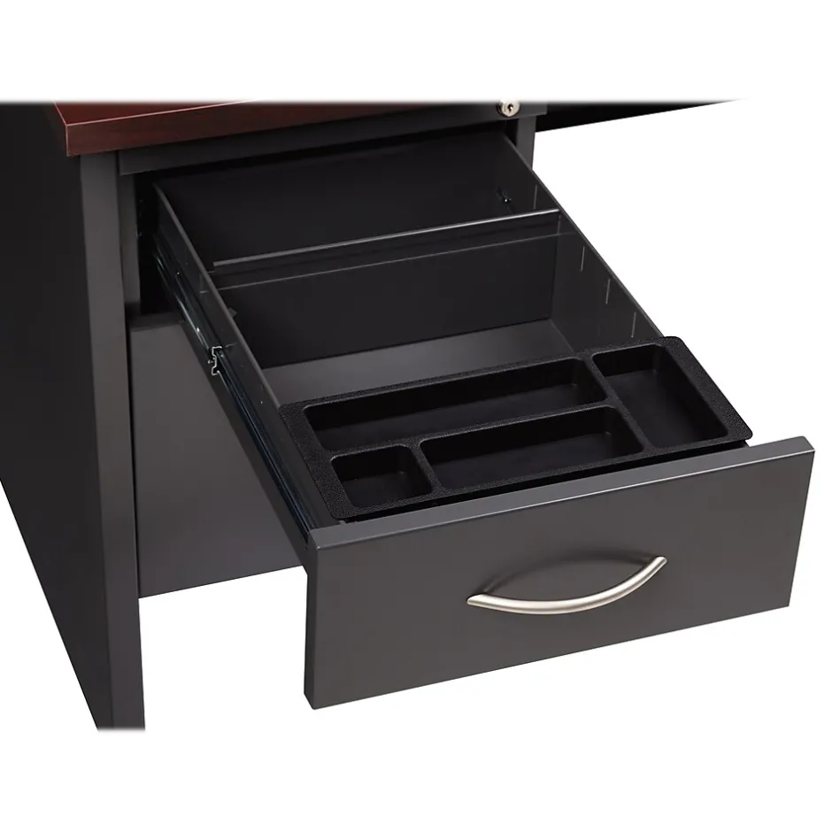 Modular double pedestal desk. Includes a core removable lock and Central locking system. Box and file drawers feature full extension slides and premium satin nickel Arch pull handles. Precision ball-bearing suspension. Durable laminate work surface with grommet holes for cord management. Radiuses profile edge banding for enhanced comfort. Full height end panels with leveling glides. One pencil tray standard per desk and one drawer divider standard per box drawer. Meets or exceeds ANSI-BIFMA standards and contains up to 28 percent recycled material. This desk is a part of our Executive Modular Desk Collection.