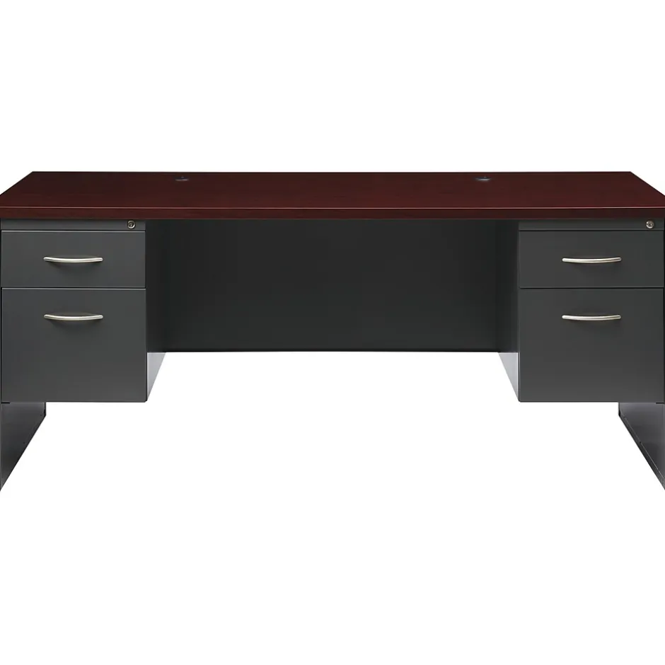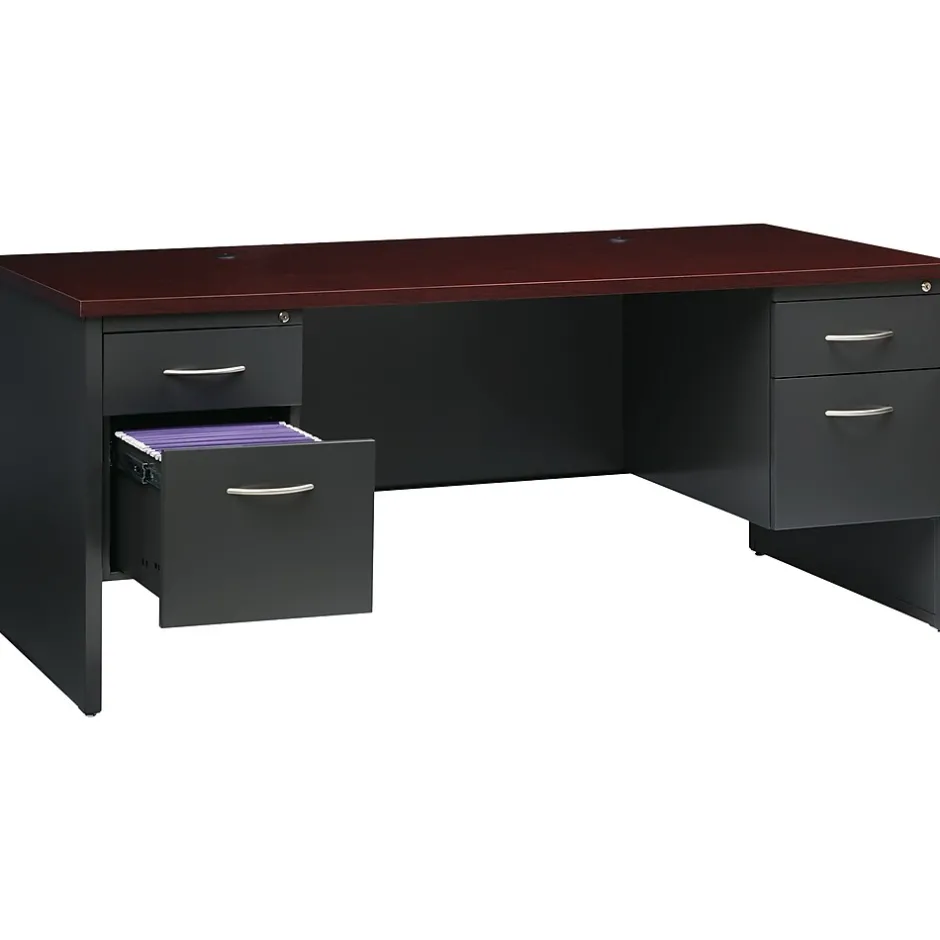 Modular double pedestal desk. Includes a core removable lock and Central locking system. Box and file drawers feature full extension slides and premium satin nickel Arch pull handles. Precision ball-bearing suspension. Durable laminate work surface with grommet holes for cord management. Radiuses profile edge banding for enhanced comfort. Full height end panels with leveling glides. One pencil tray standard per desk and one drawer divider standard per box drawer. Meets or exceeds ANSI-BIFMA standards and contains up to 28percent recycled material. This desk is a part of our Executive Modular Desk Collection.