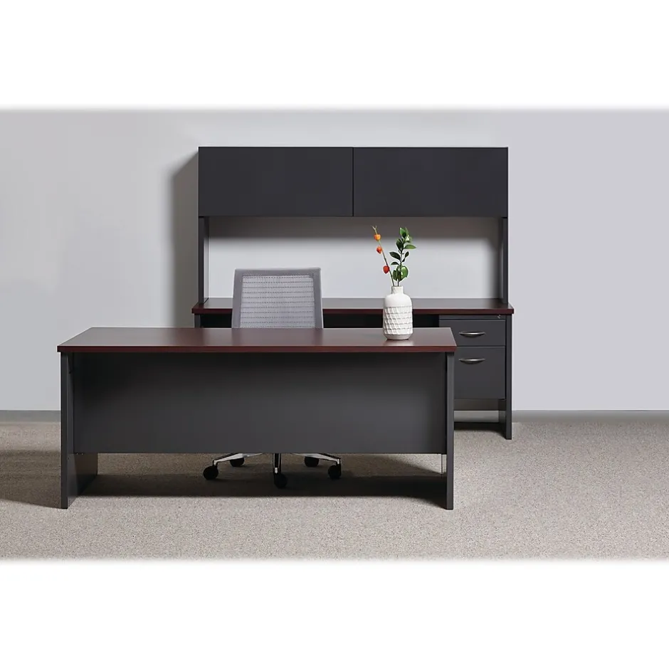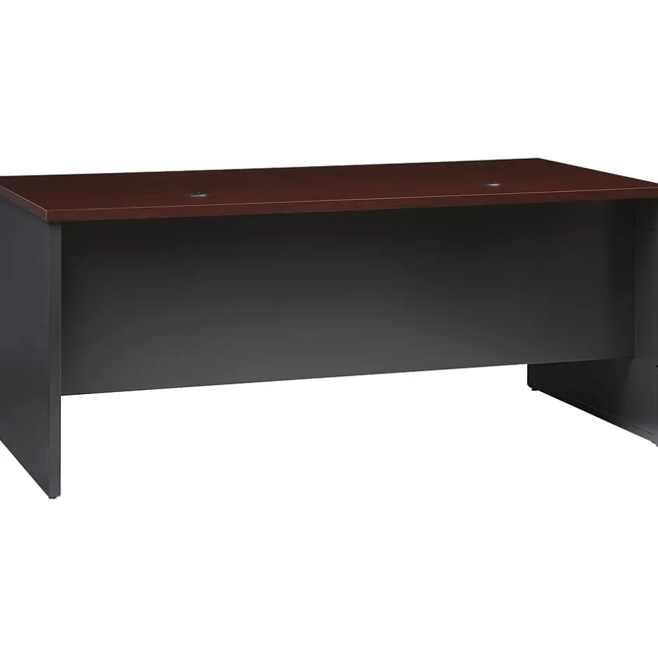- Modern-style desk is made of durable laminate in a charcoal finish with the work surface in a mahogany finish
