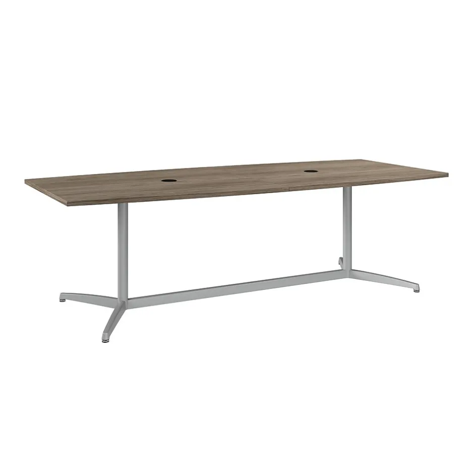 Bring your team together in a private or open plan office with the Bush Business Furniture 96W x 42D Boat Shaped Conference Table. Perfect for medium to large-sized groups, this meeting table provides ample room for 6-8 users to collaborate with laptops, paperwork and other materials. A durable thermally fused laminate surface with continuous edge banding protects against everyday damage while a finished underside prevents snagged clothing. The tabletop also has two wire management grommets to accommodate a projector or speaker phone. The conference room table is supported by a sturdy metal base for a weight capacity of 200 pounds, making it great for use in a variety of professional and educational settings. This long office table is tested to meet ANSI/BIFMA standards for safety and performance and is backed by a Limited Lifetime Warranty. North American made with globally sourced materials.
