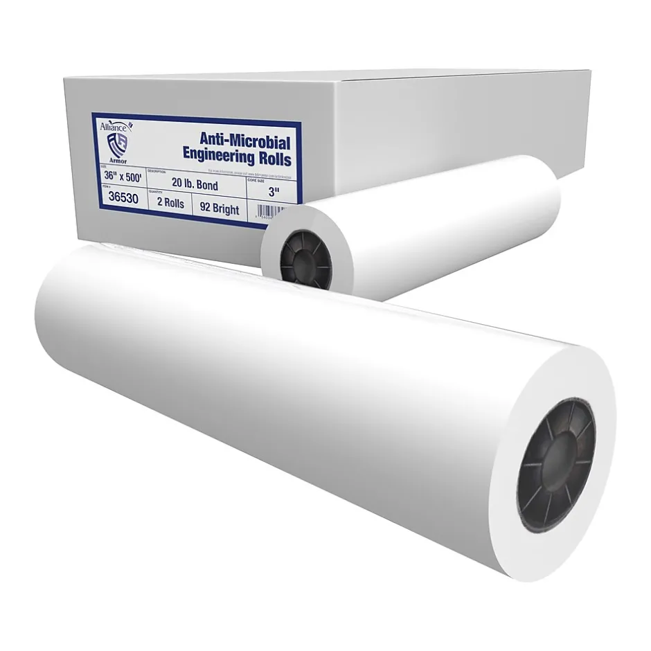 The Alliance Armor wide-format engineering paper is treated with silver ion technology to provide antimicrobial product protection against unwanted microorganisms. Creates a barrier to inhibit the growth of microorganisms on product. Silver ions attach to any microbes present and will not allow them to duplicate.