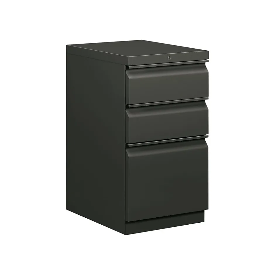 Organize a work space with this office mobile-pedestal cabinet. Three box drawers with ball bearing suspension provide easy-access storage for office supplies, and the file drawer at the bottom allows for organization of documents and hanging file folders. Place this 15-inch HON Brigade cabinet under your desk, move it easily with its swivel back casters, and lock it before leaving your desk.