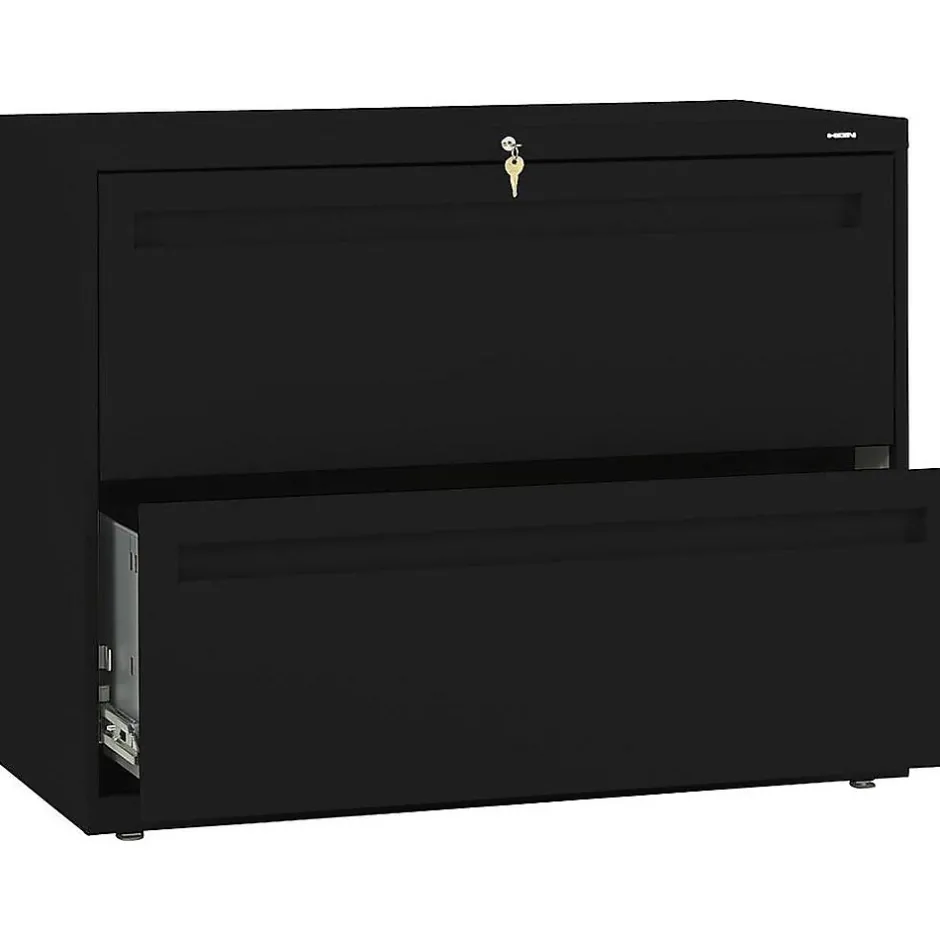 Create a convenient filing system with this HON Brigade 700 Series lateral file. Two large drawers feature heavy-duty ball-bearing suspensions for quiet operation, while the mechanical interlock system keeps both drawers from opening at the same time to prevent tipping. A removable core lock keeps documents securely stored inside. This HON Brigade 700 Series lateral file boasts a spacious top surface, providing ample room for a printer, fax machine or document scanner.