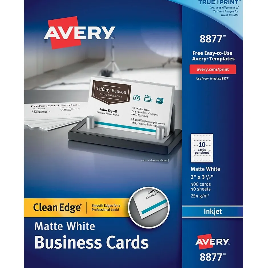 Make a lasting impression on important clients, associates and prospective customers with Avery 08877 Clean Edge Business Cards. This pack of 400 first-rate customizable business cards is made from quality cardstock with a weight of 93lbs / 254gsm, and offers an impressively substantial look and feel. If you need professional quality business cards, customer loyalty cards, appointment reminder cards or more, these 2″ x 3.5″ cards are an exceptional way to stand out from the crowd. These white business cards have innovative Clean Edge technology for quick and easy separation, giving you the cleanest, smoothest edges of any business card on the market. Proprietary Avery Sure Feed technology helps deliver a more reliable feed through your inkjet printer in order to minimize print misalignments and paper jams. Whether you have your own design or you’re creating one from scratch, take your brand or business to the next level with Avery Design & Print Online, which makes it easy to create and print double-sided customized cards from your own home or business. The free browser-based software has everything you need to design business thank you cards, personalized gift tags, reward cards, price tags and more. Try it out today on the Avery website.
