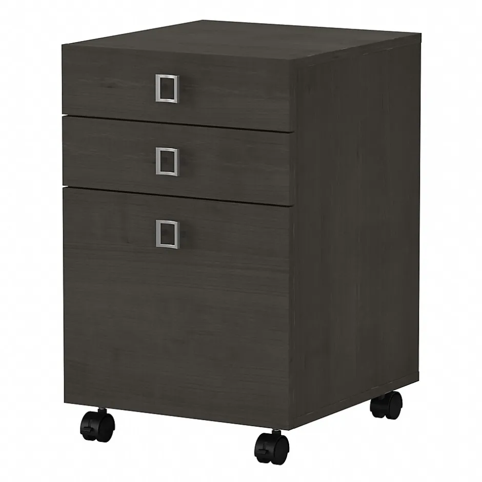 Blend style, flexibility and reliability at work or in your home. The Bush Business Furniture Echo 3 Drawer Mobile File Cabinet combines an elegant finish with fashionable Satin Silver hardware to inspire your professional best. Give your workspace commercial-grade quality that promotes growth and productivity with convenient, reliable features. This contemporary filing cabinet provides two box drawers for office supplies and utensils as well as a full-extension file drawer that opens on smooth ball bearing slides for an easy reach to letter size documents. Dual-wheeled casters allow the Cabinet to roll wherever you need storage and can be locked in place. A durable, thermally fused laminate finish maintains the beautiful appearance for years. From Bush Business Furniture, the Mobile File Cabinet comes with a 3 Year Warranty and meets ANSI/BIFMA standards.