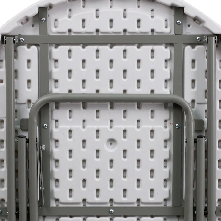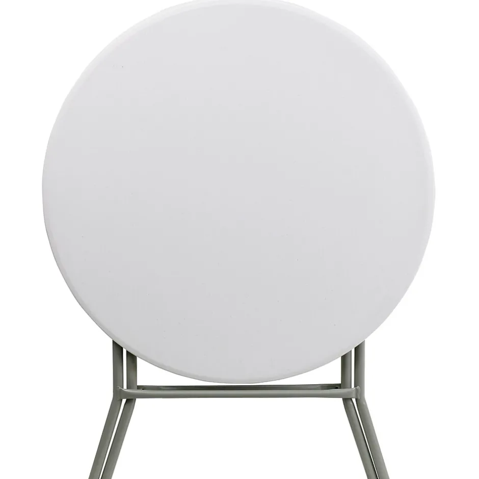 When you need a little extra surface area this folding table is the perfect choice. This plastic folding table is a convenient option when you need to set up tables for special events, cook-outs on your patio at home or when you’re serving snacks around the pool. This durable, easy to clean table is commercial rated for use in banquet halls, convention centers and at trade shows. The thick, granite white tabletop is 1.75″ thick, and will comfortably seat up to 3 adults. Its waterproof, impact and stain resistant top have a 220 pound static load capacity. Non-Locking gray powder coated cross legs fold to transport and store. Non-marring floor caps protect your floor by sliding smoothly when you need to move it. The 32″ Round Granite White Plastic Folding Table is a convenient option for your next home, school or business event. Designed for both indoor and outdoor use, store table indoors and protect the frame from extreme moisture.