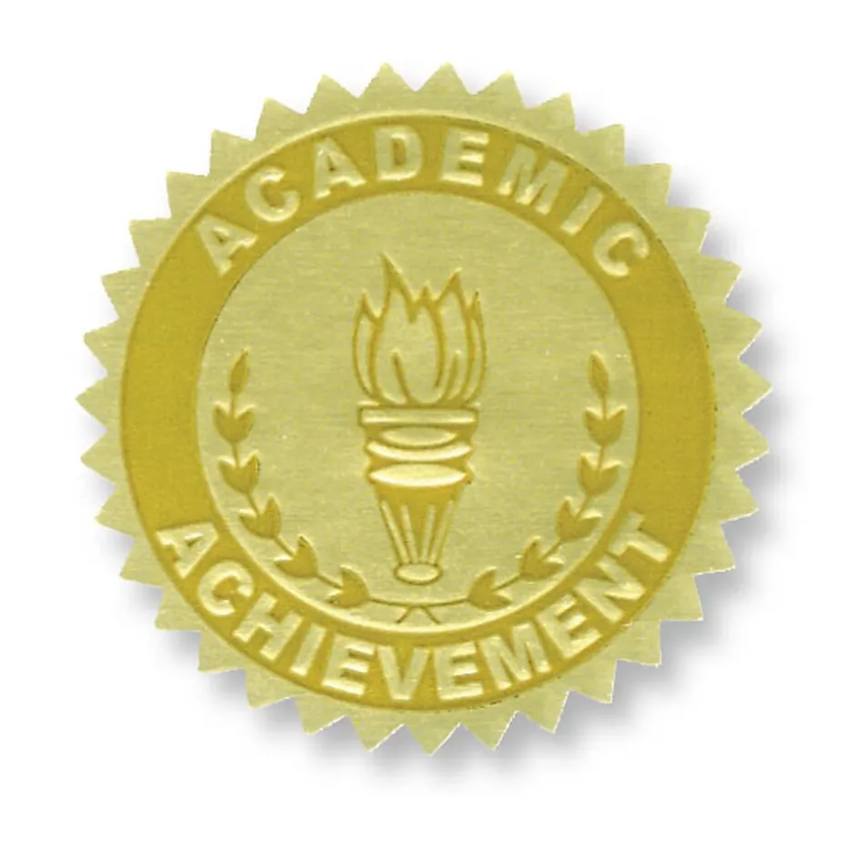 Academic Achievement Gold Foil Embossed Certificate Seals are gold foil embossed certificate seals that add an extra touch of class to any certificate, award or diploma! Embossed with Academic Achievement and decorated with a flaming torch and laurels for that special day. Also great for prizes and bulletin boards.