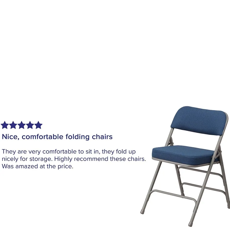 Guests will be amazed in the comfort of this Flash Furniture HERCULES Series ultra-padded upholstered metal folding chair. Whether you have planned for your guest’s arrival or had a sudden influx of family show up on your doorsteps, you’ll be well prepared with this padded folding chair. The chair provides comfort during extended meetings and social gatherings. Its 18-gauge curved powder-coated steel frame is triple-braced and double-hinged with leg-strengthening support bars to hold up to 300 lbs. Nonmarring floor glides on the legs protect your floors by sliding smoothly when you move it. Built for commercial use, this attractive chair is a smart seating solution for your next business meeting as well as in the home for family gatherings and other social events. After outdoor events, store indoors to protect the frame from extreme moisture. With nothing to assemble, this chair comes ready to service your needs.