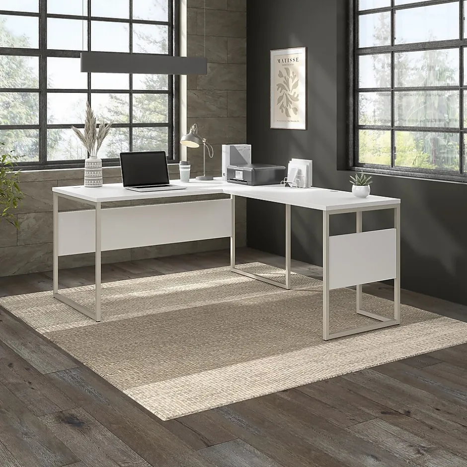 The Bush Business Furniture Hybrid L-shaped table desk blends a durable work surface with sturdy metal legs to offer a stylish, long-lasting solution for the modern professional. Tackle your next project or assignment with a computer, books, and more on a desktop that supports up to 200 lbs. Three built-in wire management grommets keep cords and cables in order, so your work area remains free from unnecessary clutter. The corner desk’s open leg design and finished privacy panel allows it to look great facing any direction in a home or professional office environment. This modern computer desk has been meticulously tested to meet or exceed the ANSI/BIFMA standards for safety, durability, and performance and is backed by a 10-year manufacturer warranty. American-made with US and imported parts.