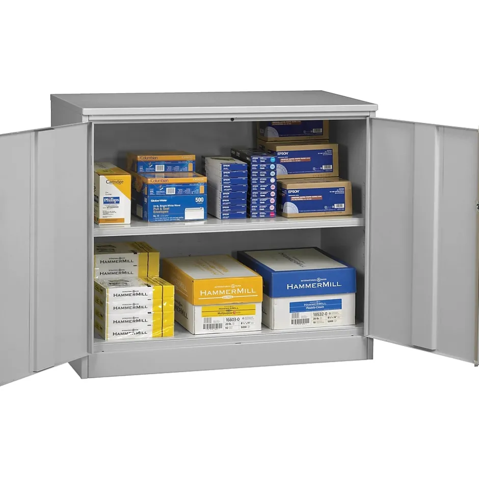 This storage cabinet features built-in shelf support tabs that secure shelves tightly to the cabinet without clips or added parts.