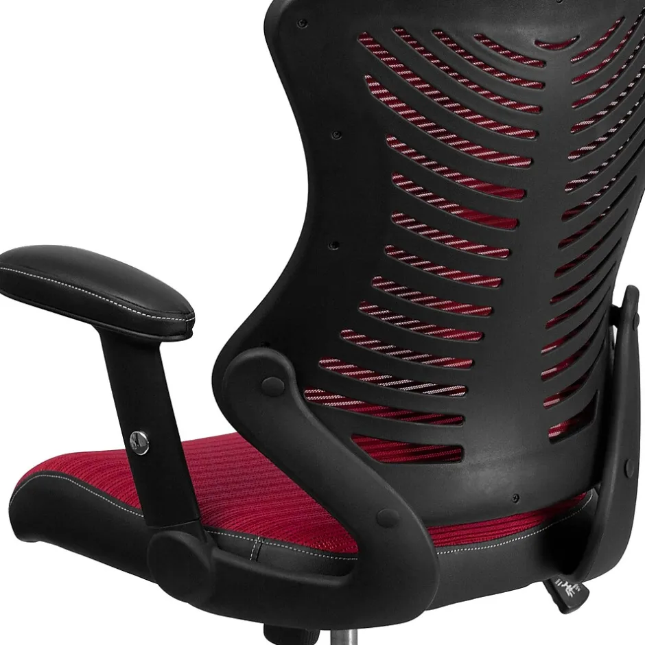 If you’ve never owned a mesh back chair, then you’re in for a real treat with this burgundy mesh ergonomic task chair. The ventilated design allows air to circulate to your back, keeping you cool and comfortable enabling you to concentrate on the task at hand and increasing your productivity. This chair has important features such as an innovative curved back with lumbar support, pneumatic seat height adjustment and the ability to recline/rock back and forth with the tilt lock mechanism that make your purchase worthwhile. Padded and adjustable arms offer proper relief to your shoulders and neck while the waterfall seat reduces pressure on your legs. Ribbed details and white contrasting stitching on the seat and arms make this a welcome addition to your workspace whether in the office or home. Upgrade your seating with this designer executive office chair and make your work day much more enjoyable.