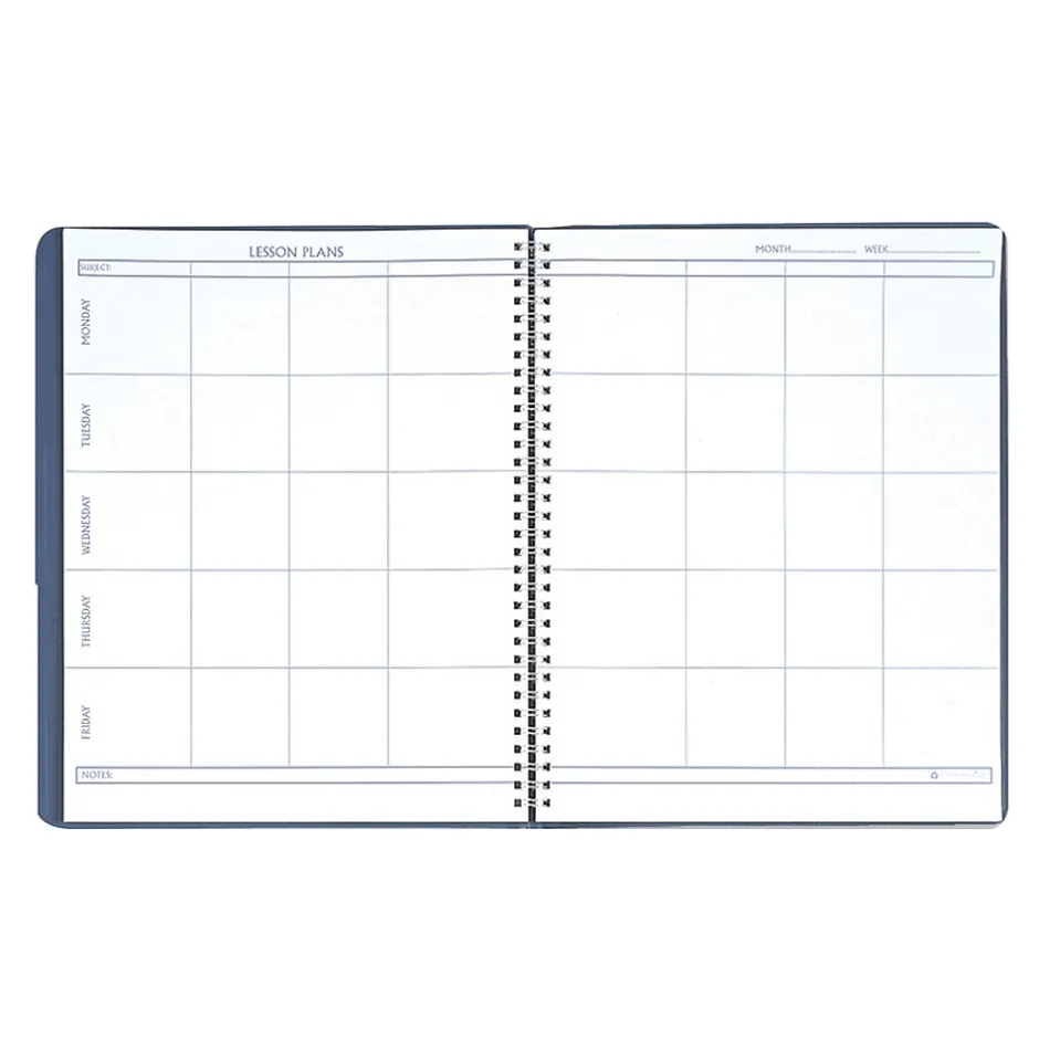 Weekly lesson planner. Blue embossed simulated leather cover. Weekly lesson planner for eight class periods for up to 41 weeks with extra pages for changes. Designed to last one year. Spiral-Bound. Includes two calendar pages, two school events pages, semester outlines and eight seating charts per semester. Paper Color: White; Cover Color: Blue; Sheet size: 11″ x 8 1/2″. Printed on 100% post-consumer recycled paper with soy ink. Made in the USA. Sold as a pack of 2 lesson planners.