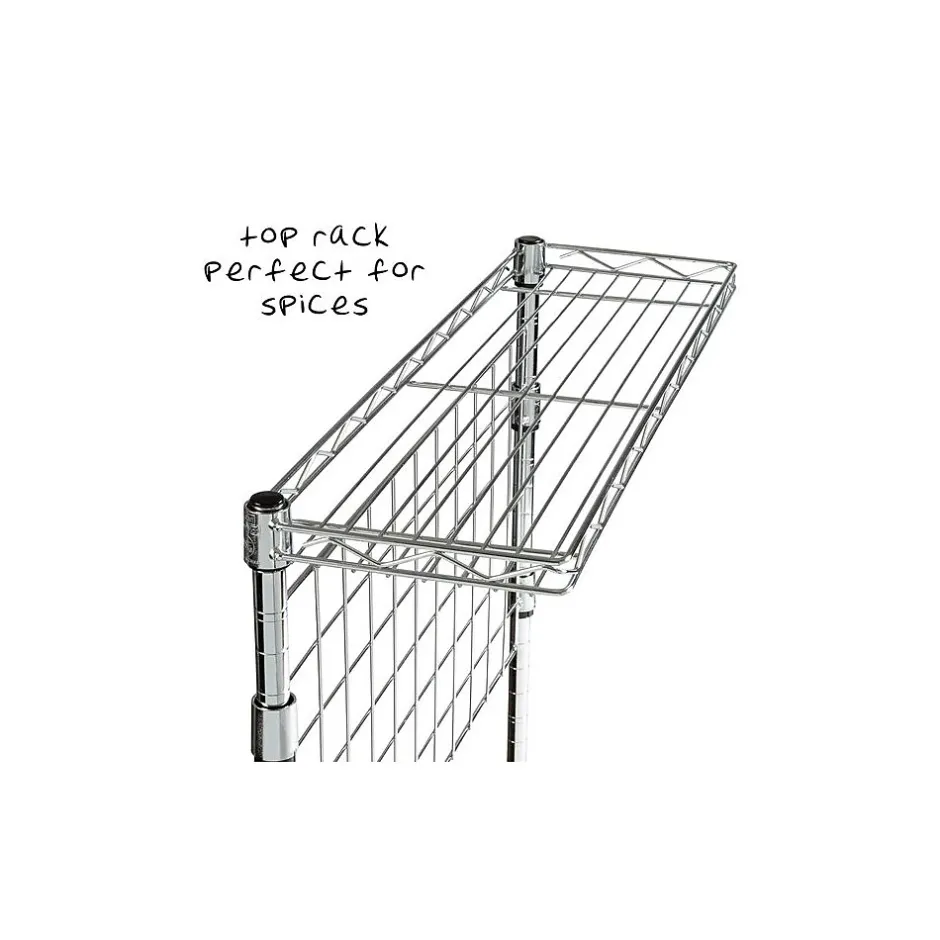 Brilliant chrome finish and contemporary design makes this unit the perfect blend of good looks and functionality. Its sturdy, commercial quality frame has two thick grid-style, adjustable wire shelves (lower withstands 200 lbs.) and a bonus top rail for spices. Features an easy no tool assembly, open wire design for easy cleaning, and leg levelers for use on uneven floors. Instantly create additional space and organization to your kitchen.