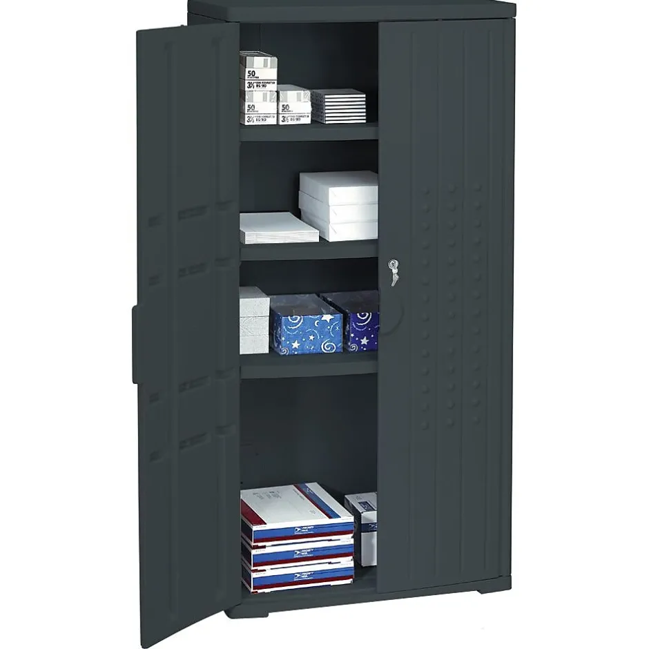 Iceberg Storage cabinet in black color includes three shelves, two adjustable shelves that can securely holds up to 75 lbs and key lock system for security purpose. Cabinet is easy to clean and offers resistance towards chemicals.