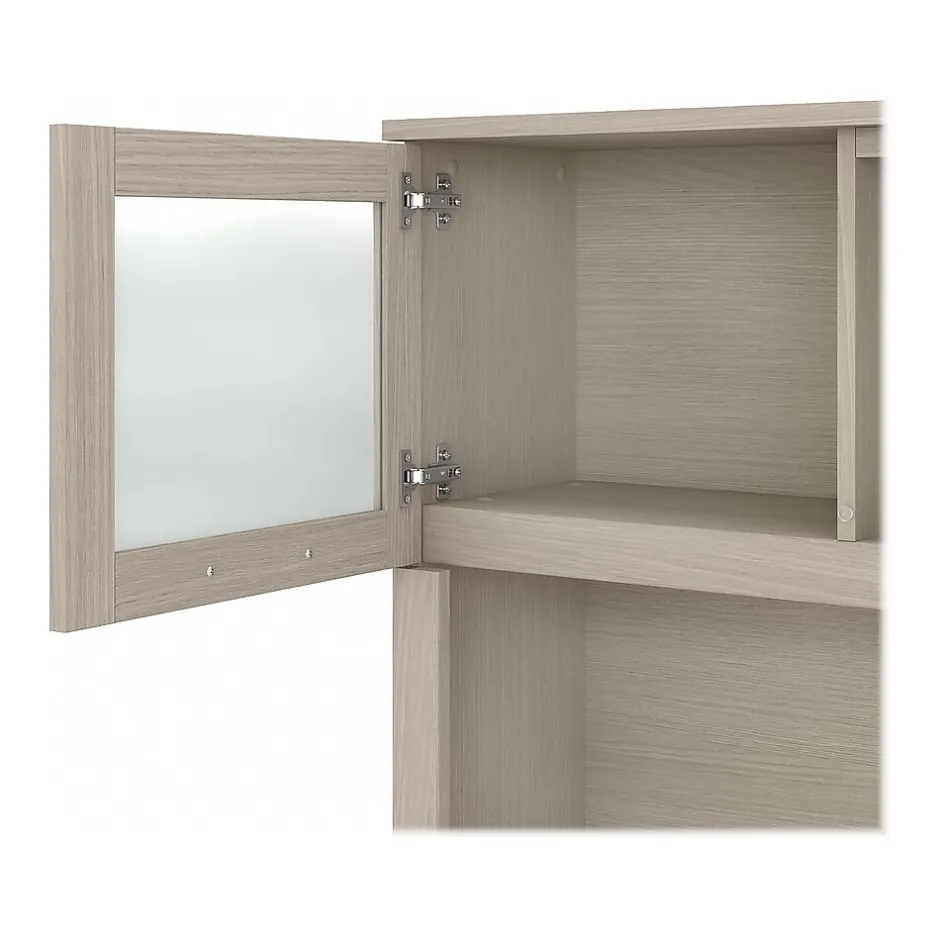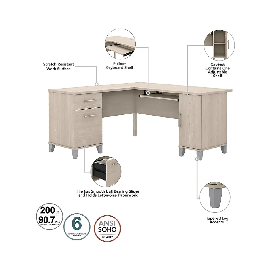 Maximize the potential of your home office with the Bush Furniture Somerset 60″W L-shaped desk with hutch. Create your remote work headquarters with space for a computer, phone, printer, and more. A convenient pullout shelf provides a perfect place to keep a keyboard or laptop, while a storage cabinet and box drawer offer plenty of space for supplies. A file drawer with ball bearing slides allows for easy access to letter-size documents. A wire management slot helps keep cords and cables in order. The hutch features open compartment for books or decorations, an adjustable shelf to hold work in progress, and two frosted glass doors that provide concealed storage. This home office furniture set is tested to meet ANSI/SOHO standards for safety and performance and is backed by the Bush Furniture 6-year manufacturer warranty. American-made with US and imported parts.