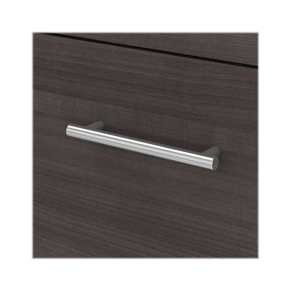 Maximize the potential of your home office with the Bush Furniture Somerset 72″W L-shaped desk with storage. Create your remote work headquarters with space for a computer, phone, printer, and more on a surface that features wire management slots for keeping cords and cables in order. A convenient pull-out shelf provides a perfect place to keep a keyboard or laptop, and the desk also includes a vertical storage cabinet with an adjustable shelf. Place pens, paper, and more in the box drawer, and enjoy a file drawer gliding on smooth ball bearing slides for an easy reach to documents. Transitional styling includes a stylish finish with tapered legs and contemporary metal hardware for an alluring appearance. This desk with storage meets or exceeds ANSI/SOHO standards for safety and performance and is backed by a 6-year manufacturer limited warranty. American-made with US and imported parts.