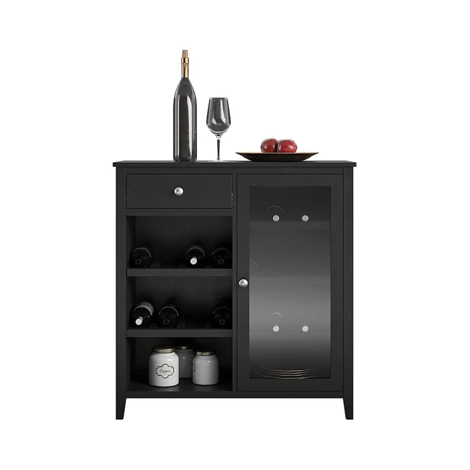 Upgrade your next party with the Ameriwood Tuxedo bar cabinet. Stylish black MDF finish pairs with the glass door to add a sophisticated look to your space. Use as a bar cabinet and store your wine and liquor bottles, glasses, and mixers on the seven shelves, or use as a stylish coffee bar. Five shelves are reversible to use as either a flat shelf or a ribbed shelf for bottles. The drawer is perfect for smaller items like utensils and napkins to have everything you need to host your next party. The bar cabinet ships flat to your door and requires assembly upon opening. Two adults are recommended to assemble.