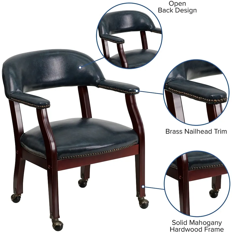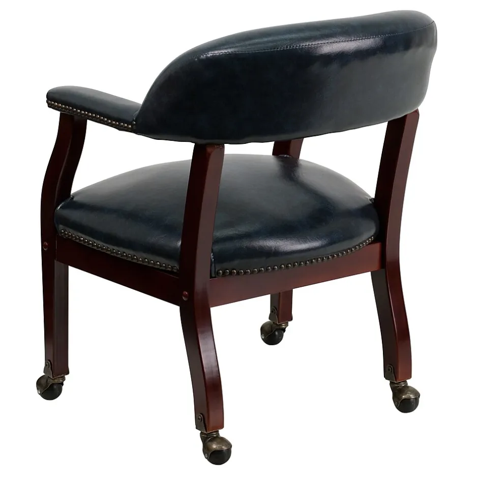 This Flash Furniture office chair combines the vintage charm of brass nail trim, navy blue vinyl upholstery and mahogany-finished wood for a refined appearance. It offers supportive features like a contoured back and sculpted armrests, so office guests are comfortable during meetings. The hardwood frame and leather-like upholstery on the armrests add to the luxury of the Flash Furniture blue conference chair.