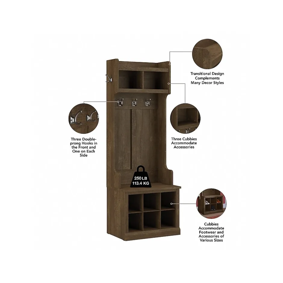 The Bush Furniture Woodland 24W Hall Tree and Small Shoe Bench with Shelves combines transitional styling and a practical design to offer an ideal entryway organizer. Have a seat on the durable bench and take a moment to relax as you get ready to head out the door or come home after a long day. The top of the mudroom bench supports up to 250 pounds, so you can sit down to put on and take off your shoes or set bags down with confidence. Six built-in cubby spaces keep your home organized while providing easy access to footwear. The narrow Hall Tree features three coat hooks in the front and one on each side for hanging jackets, hats, and more. Smaller items like gloves and keys can be stashed inside two open compartments. This entryway bench with storage has been rigorously tested to meet Bush Furniture’s standards for safety, performance and durability and is backed by a 3 Year Warranty.