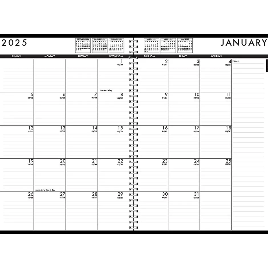 - One weekday per page, one month per two-page spread, three-year calendar reference page for long-range planning, Julian dates and days remaining for quick reference