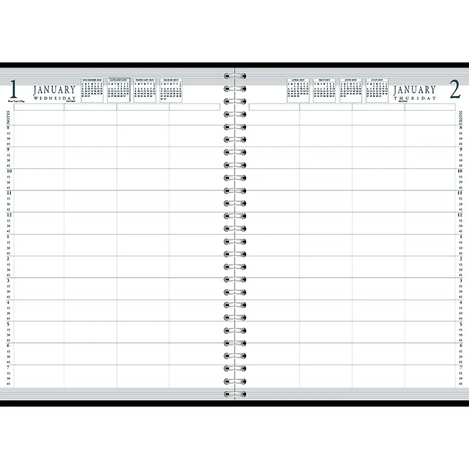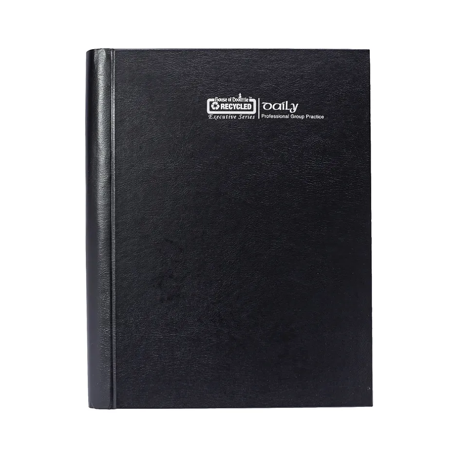 This House of Doolittle four-person daily group practice calendar planner covers 12 months, from January 2025 through December 2025, for uninterrupted, easy planning. The daily spreads offer one-day view per page, designed to plan the schedules for up to four people on a single page, with quarter-hourly appointment times from 8:00 a.m. to 7:45 p.m., Monday to Friday, and 8:00 a.m. to 5:45 p.m. for Saturdays, with open Sundays. The planner is spiral-bound with 90% recycled wire, and the hardcover is black simulated leather with an enclosed spine. This is a perfect daily planner for a busy medical doctor’s office, legal office, sales representatives, or any other team that is looking to have an easy way to schedule all of their team members’ appointments in one location. Printed with soy-based inks on 100% postconsumer recycled paper. Made in the USA and FSC certified.