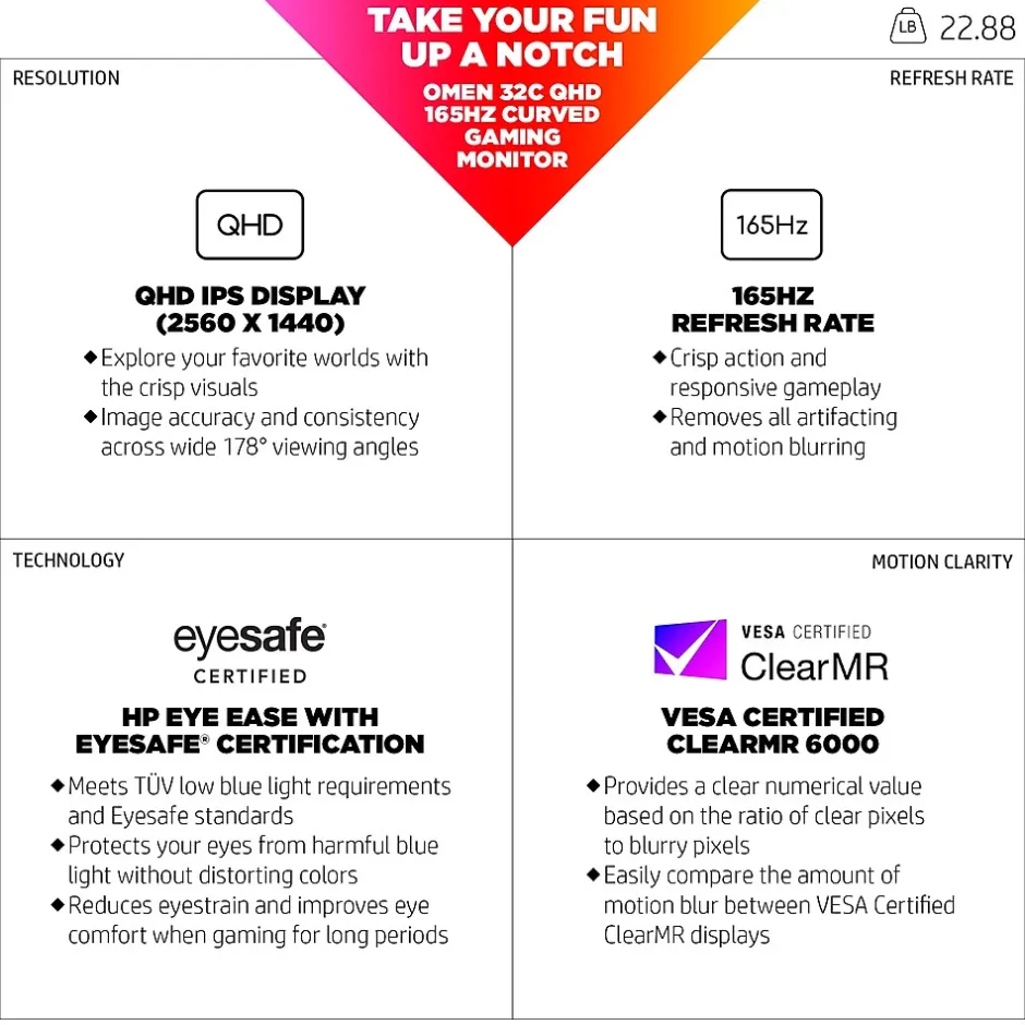 - To keep things flowing, this display features a fast 165Hz refresh rate that reduces motion blur, so every pixel keeps up with you